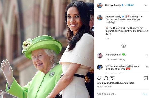 The Queen wished Meghan a happy birthday with a post on the official Royal Family Instagram account. The post includes a photo of the Duchess of Sussex and Her Majesty smiling together at a joint event in 2018 in Chester.