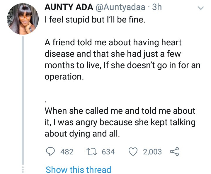 Later, she said she received a call from her friend’s mother and when she asked the older woman about her daughter’s heart disease, the woman forbade it and said her daughter doesn’t have any disease.