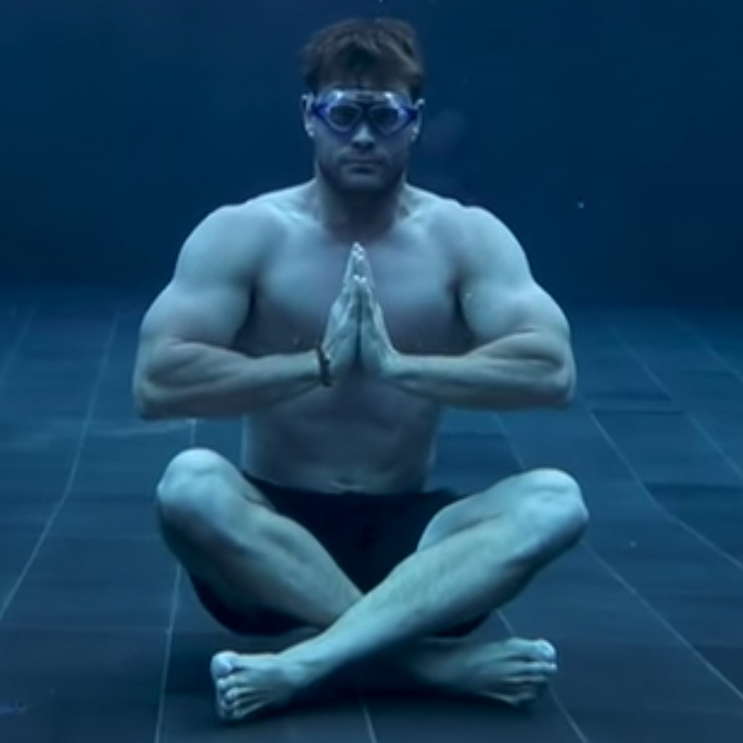 Chris, as buff as ever, sits cross-legged at the bottom of a pool while wearing goggles during the video, which he calls, “Affirmations That Positively, Absolutely, Probably (Most Likely) Won’t Make Your 2020 Worse.”