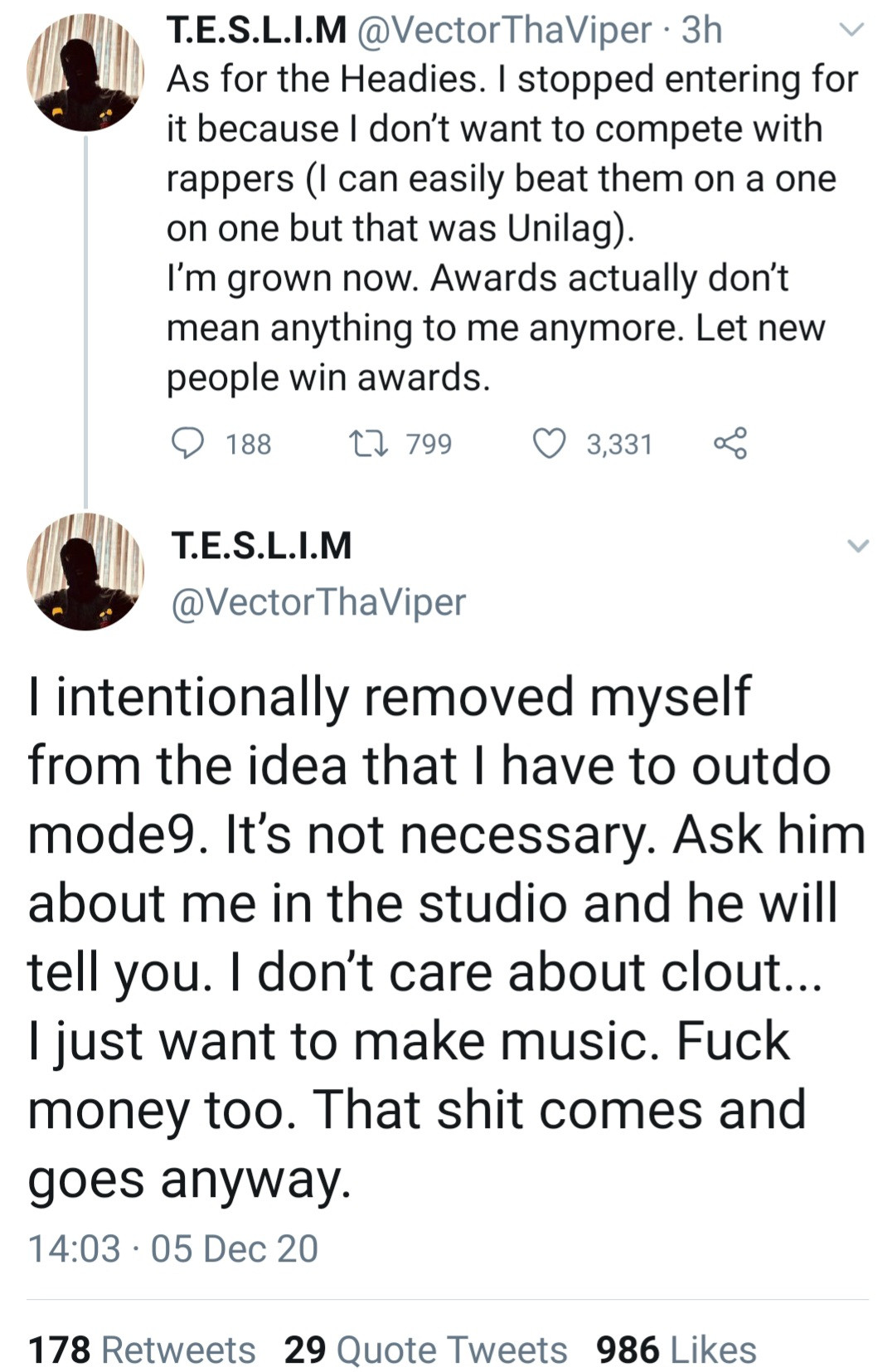 He added that he’s grown now and awards don’t mean anything to him anymore. He stated that he doesn’t care about money or clout and only wants to make music.