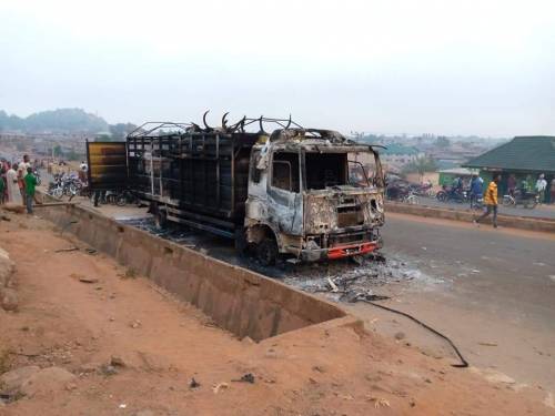 Youths in Saki, a town in Oyo State, on Monday burnt a truck taking cattle out of Saki, for killing a boy, Ayuba Raji.