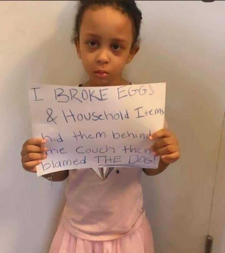 The parents wrote her “crimes” on a sheet of paper and took photos of her with her “charge sheet”.