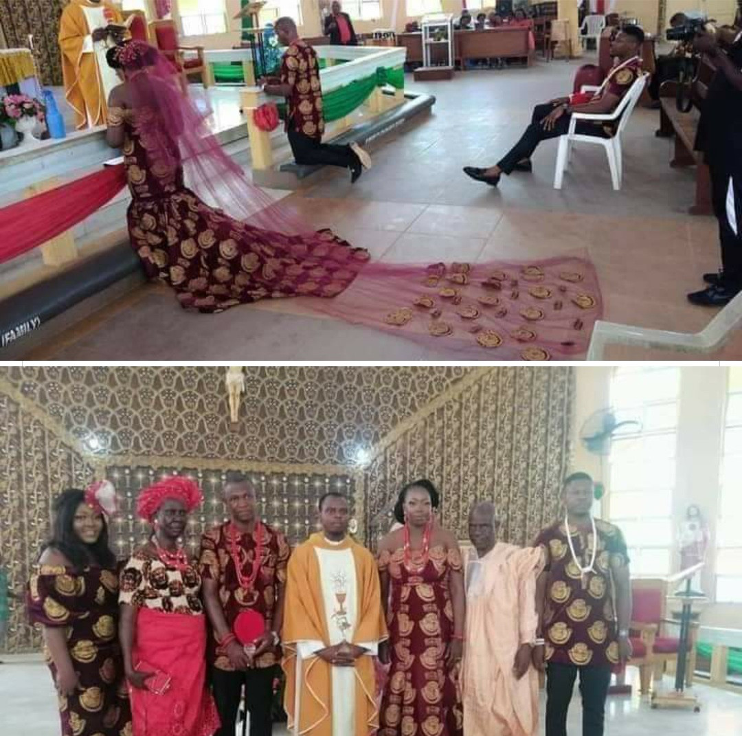 A Nigerian couple chose to have their church wedding dressed in the Igbo traditional attire known as Isiagu.
