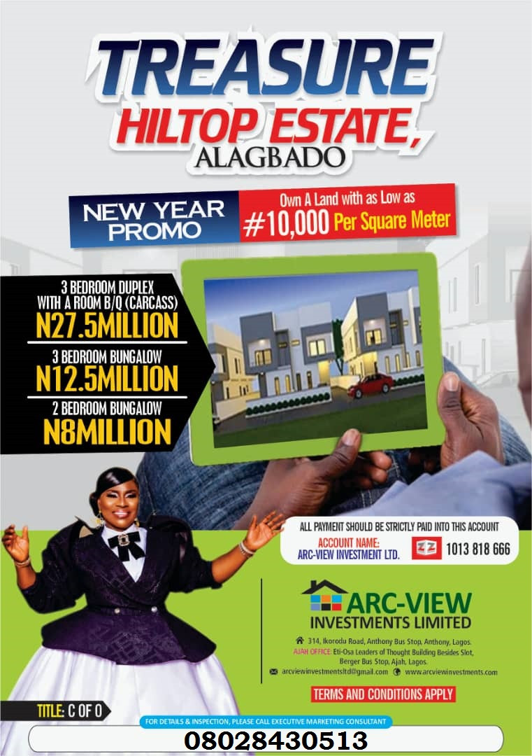In response to the yearnings of its prospective clients living in Nigeria and abroad, Arc-View Investment Limited has launched a New Year Promo Offer for its Treasure HillTop Estate in Alagbado. The offer gives prospective clients the opportunity to own a piece of the beautiful estate for as low as N10,000 per sqm.