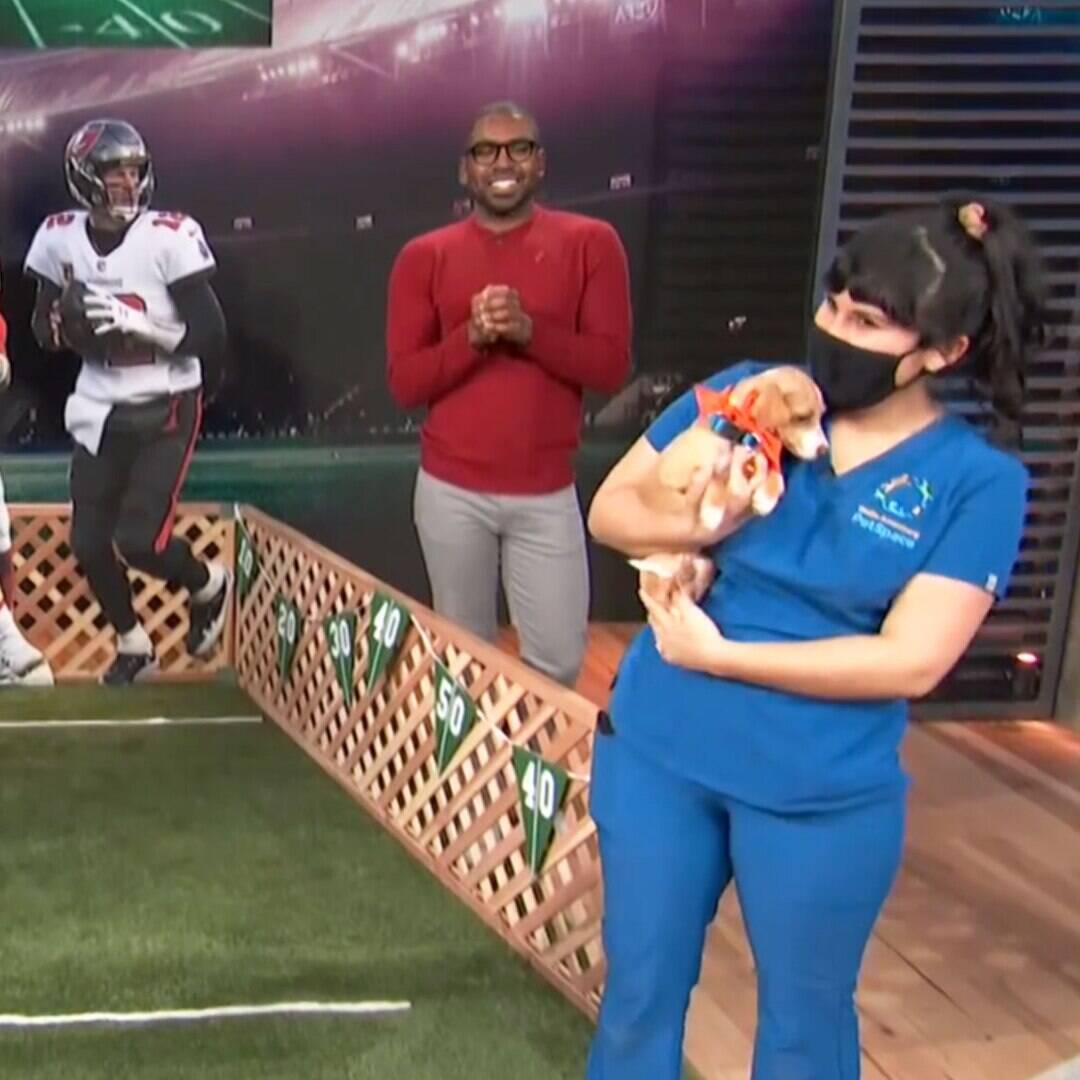 In honor of the upcoming event, Culiner and Sylvester had the visiting pups predict the Super Bowl winner. “We’ve got our two quarterbacks here at the finish line, Mahomes and Brady,” Culiner explained. “We’ve got the orange bandana, represents the Chiefs, and the blue bandana will represent the Buccaneers.”