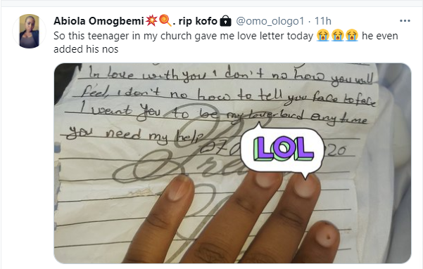 A Nigerian lady has taken to Twitter to post the love letter a teenager in her church wrote to her.