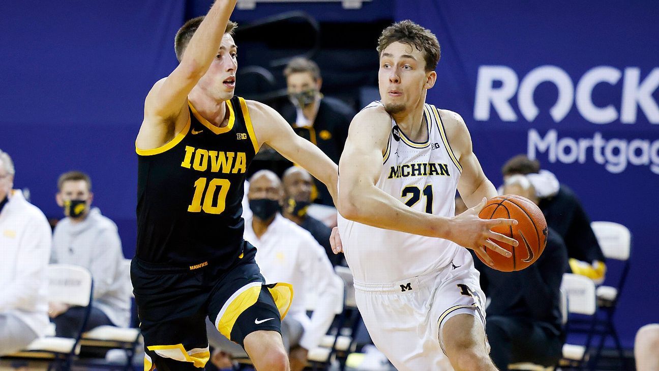 They overcame a slow first half against Iowa to run the No. 9 Hawkeyes out of the gym in the second half, pulling away for a dominant 79-57 victory. Michigan center Hunter Dickinson more than held his own against Iowa’s Luka Garza, forcing the Wooden Award favorite into a 6-for-19 night from the field while scoring 14 points of his own at the other end. Franz Wagner, the Wolverines’ best NBA draft prospect, had 21 points and was consistent all game, while Isaiah Livers made four 3-pointers and had 16 points.