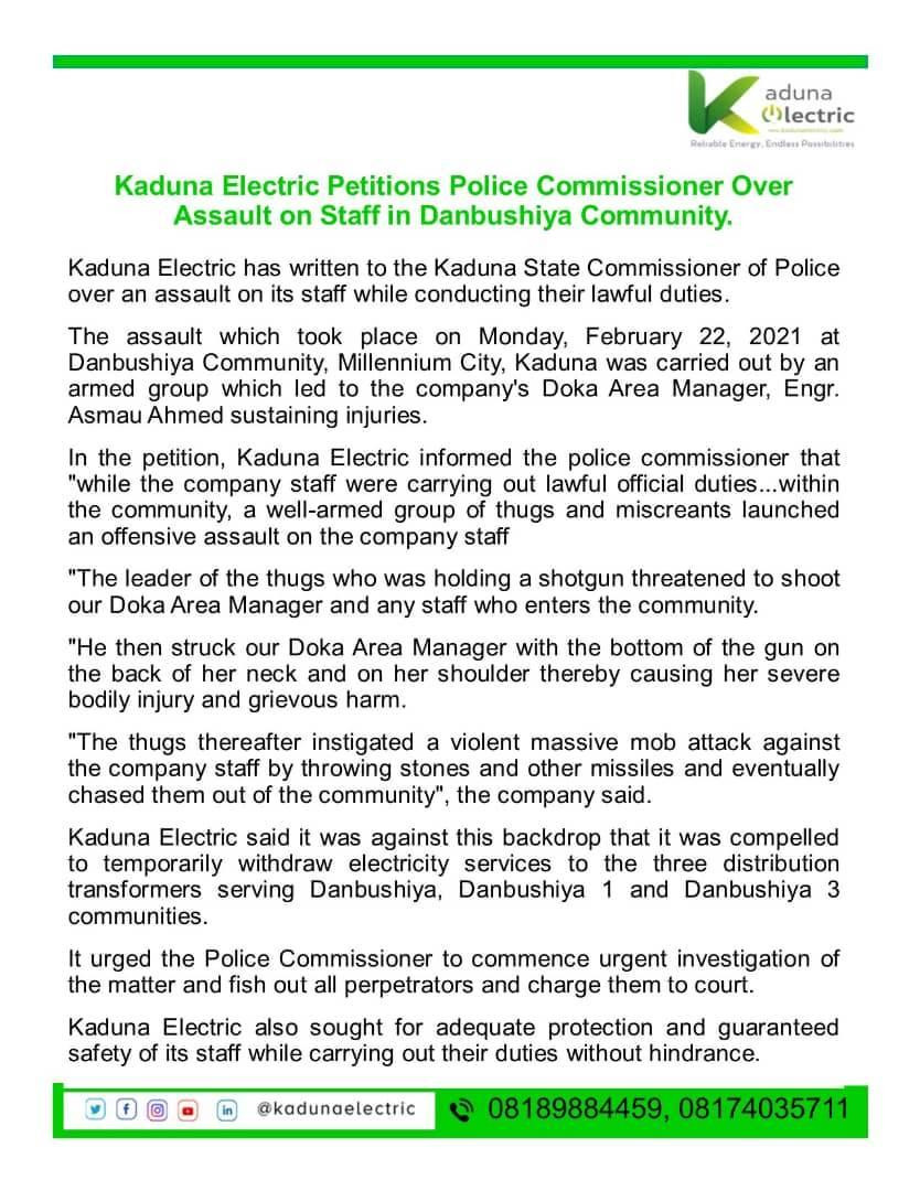 Kaduna Electric said because of the incident, it was compelled to temporarily withdraw electricity services to the three distribution transformers serving Danbushiya, Danbushiya 1, and Danbushiya 3 communities.