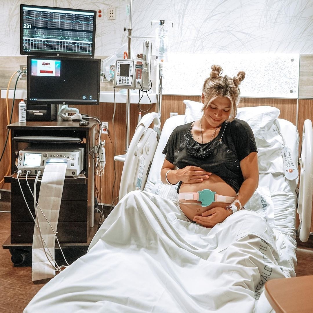 “It’s OFFICIAL!! We are getting induced on TUESDAY!!!,” she wrote in the Instagram caption alongside a photo of her and Chris holding a pair of sparkly gold booties. “We had great news yesterday—the cyst has NOT grown since last week (yay!!) but our doctors feel that if we induce between 37-38 weeks I can still have a normal delivery as planned!!!!”