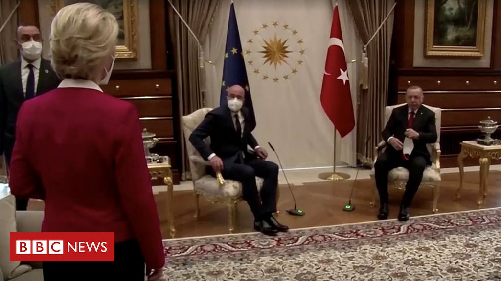 But when the three leaders came to sit down, there were just two chairs, one with a Turkish flag behind it, the other with an EU flag. The two men take their seats in two gilded Ottoman-style chairs, while the Commission president is left standing, making her displeasure absolutely clear with an “Ahem” (“Ähm” in her native German).