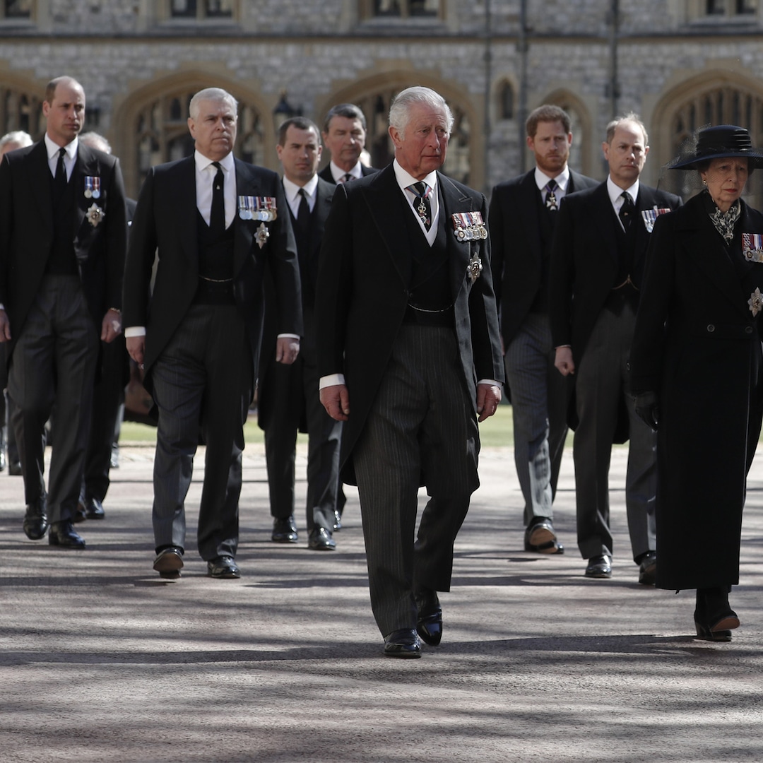 Following closely behind the green truck were Princess Anne and Prince Charles in the first row, then Princes Edward and Andrew. In the third row, the Duke’s grandchildren Prince William, Peter Phillips—Anne’s son—and Prince Harry walked together solemnly.
