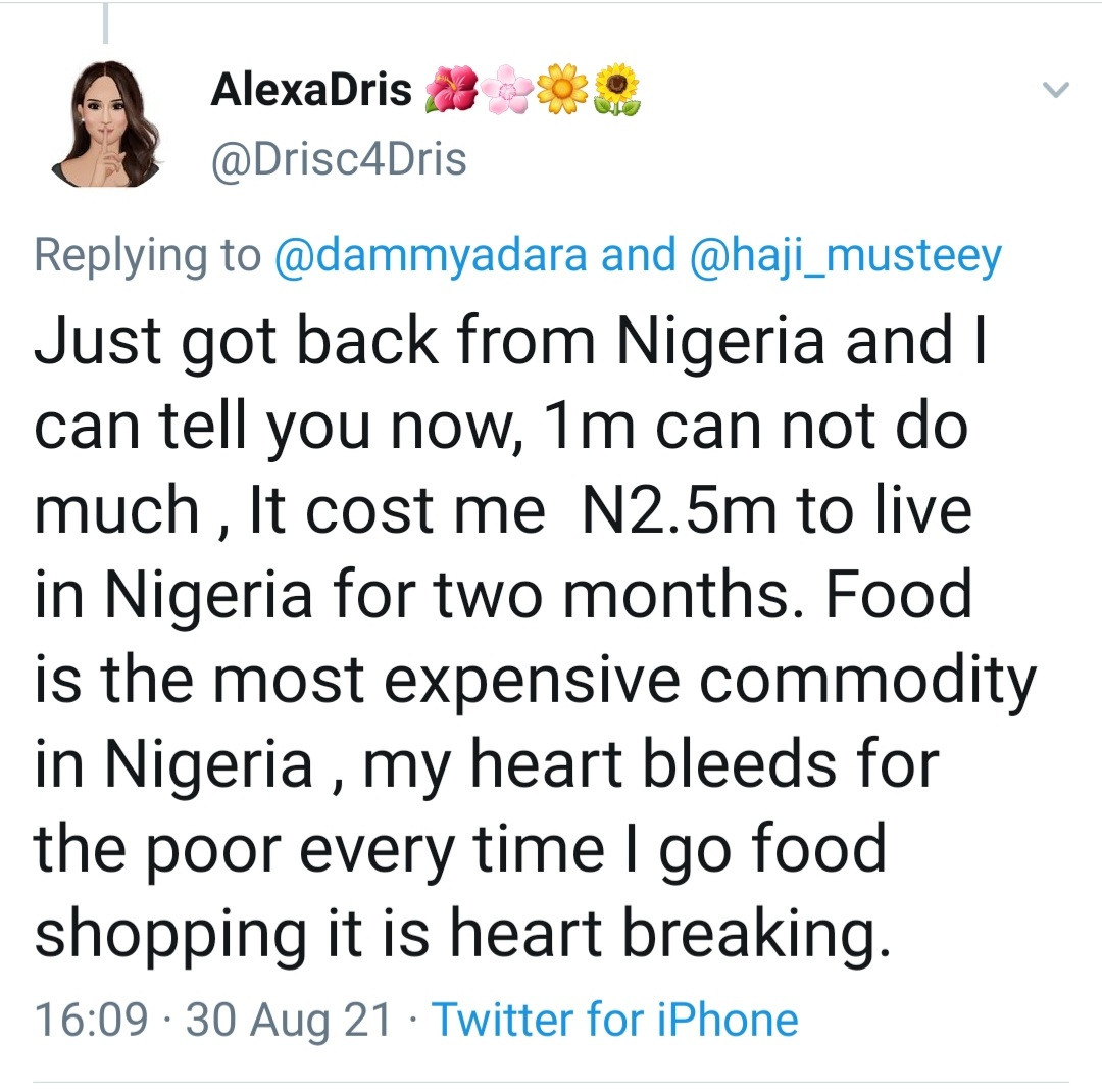 Her tweet reads: “Just got back from Nigeria and I can tell you now, 1m can not do much , It cost me N2.5m to live in Nigeria for two months. Food is the most expensive commodity in Nigeria , my heart bleeds for the poor every time I go food shopping it is heart breaking.”