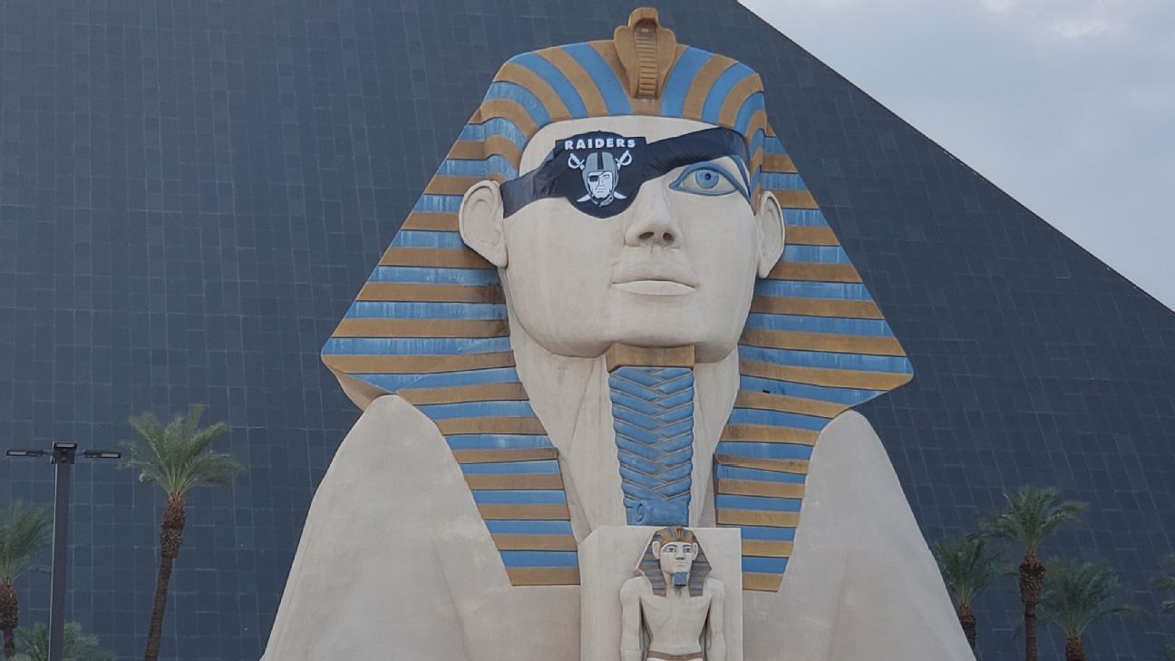The Sphinx at the Luxor Hotel and Casino is sporting a Raiders eye patch on its right eye, a year after Lady Liberty wore a very large Raiders jersey in front of New York-New York Hotel and Casino at the corner of Tropicana Boulevard and the Strip.
