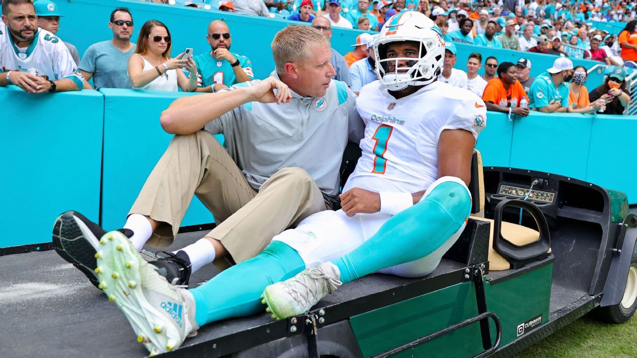 Tagovailoa was carted off to the locker room Sunday with a rib injury after taking a hit from Buffalo Bills defensive end AJ Epenesa during Miami’s second drive.
