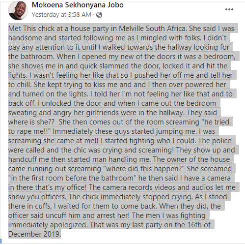 According to Mokoena Sekhonyana Jobo, the incident occurred at a house party in Melville South Africa, and involved a lady who complimented his looks and “began following him while he mingled with folks” at the party.
