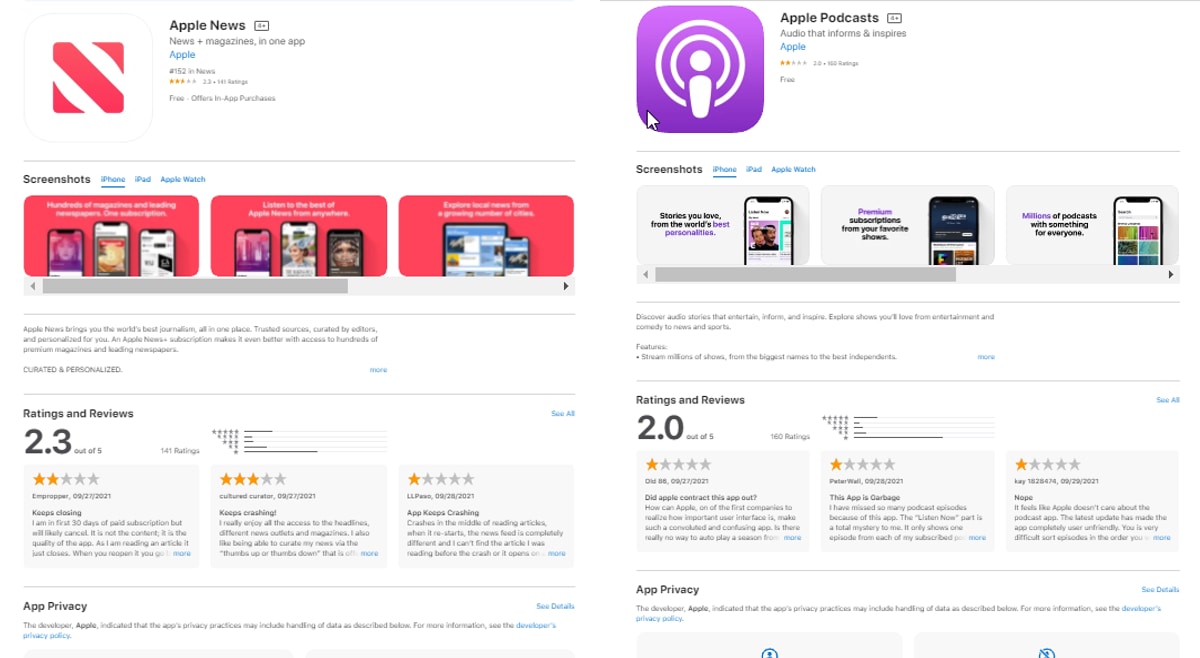 Surprisingly, Apple’s Podcast app currently fares the worst with just a 2.0 rating. Reviews at the time of writing this were largely complaints from users miffed with the redesign. Apple News gets a 2.3-star rating with complaints of frequent app crashing. The Translate app also just has 2.2 stars and users are comparing it with Google Translate in the reviews section.