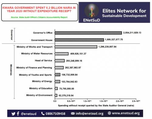 An anti-corruption civil society organisation, the Elites Network for Sustainable Development, (ENetSuD), has frowned at the spending of N6,265,010, 819.98 by the Kwara State Government in the year 2020 without relevant expenditure receipts.