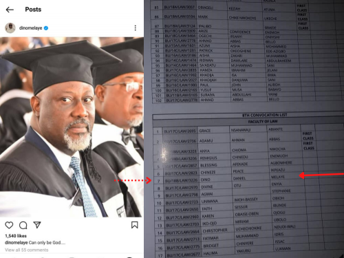 Former Kogi West Senator in the eighth National Assembly, Dino Melaye, graduated with Second Class Lower Division and grappled with several “carry-overs” while studying Law at the Baze University in the Federal Capital Territory, Abuja, SaharaReporters has learnt.
