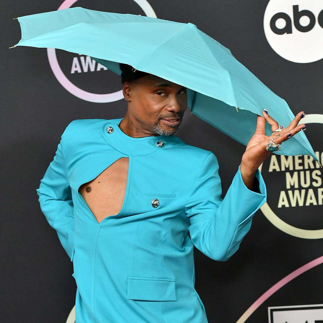 Billy Porter brought all the shade (literally) with his American Music Awards fashion. The Pose star graced the carpet, Sunday, Nov. 21, in blue number that was sure to keep all the fashion haters out of his way. The 52-year-old actor arrived rocking a soft blue suit by Botter—that showed off a little bit of chest. In addition, Billy wore black leather platform boots and a stunning extra-large ring.