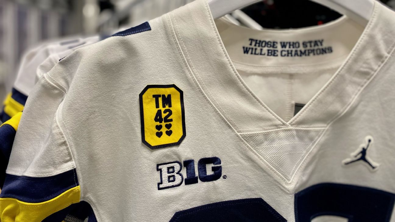 To pay tribute to those victims and the local community, Michigan will wear a patch in the shape of a “Block O” to represent Oxford and will feature the initials “TM” and the number 42 with four blue hearts below it.