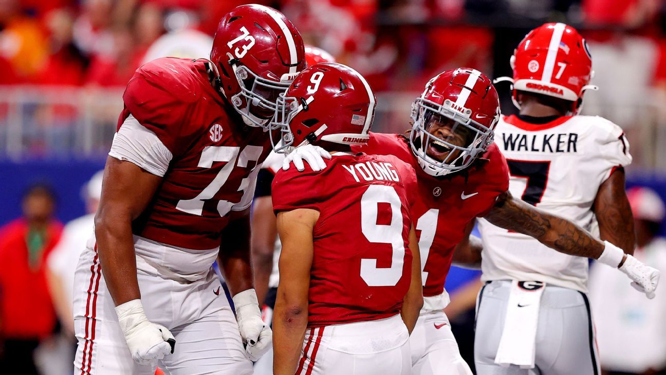 Alabama played the second half without one of its top receivers, John Metchie III, who suffered what Tide officials believe to be a torn ACL in his left knee in the first half and is expected to miss the College Football Playoff, sources told ESPN’s Mark Schlabach. But Jameson Williams shredded the Georgia secondary with seven catches for 184 yards and two touchdowns.
