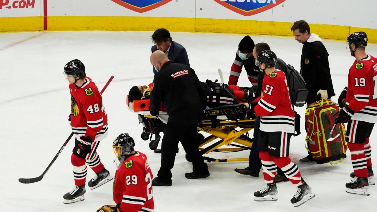 The Blackhawks said Khaira suffered an “upper-body blow” and was taken by ambulance to Northwestern Hospital for further testing.