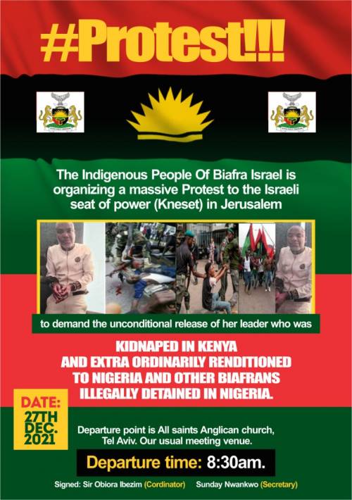 SaharaReporters learnt that IPOB members in Israel are organising that the protest will commence from All Saints Anglican Church, Tel Aviv by 8:30 am on Monday, 27th December, 2021.