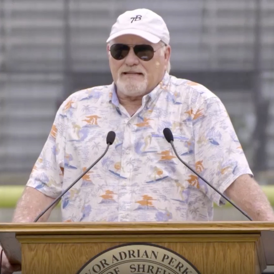 “This is a very exciting day for our city,” Mayor Perkin starts. “We get to welcome our hometown hero, Mr. Terry Bradshaw, back here. He was the first player selected in the 1970 NFL draft, led the Pittsburgh Steelers to eight AFC Central championships and four Super Bowl titles.”