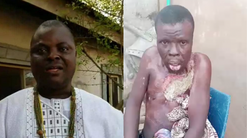 According to the victim, identified as Lateef Adeosun, he was almost burnt to death after he caught the herbalist and others with two human heads in his shrine in the community.