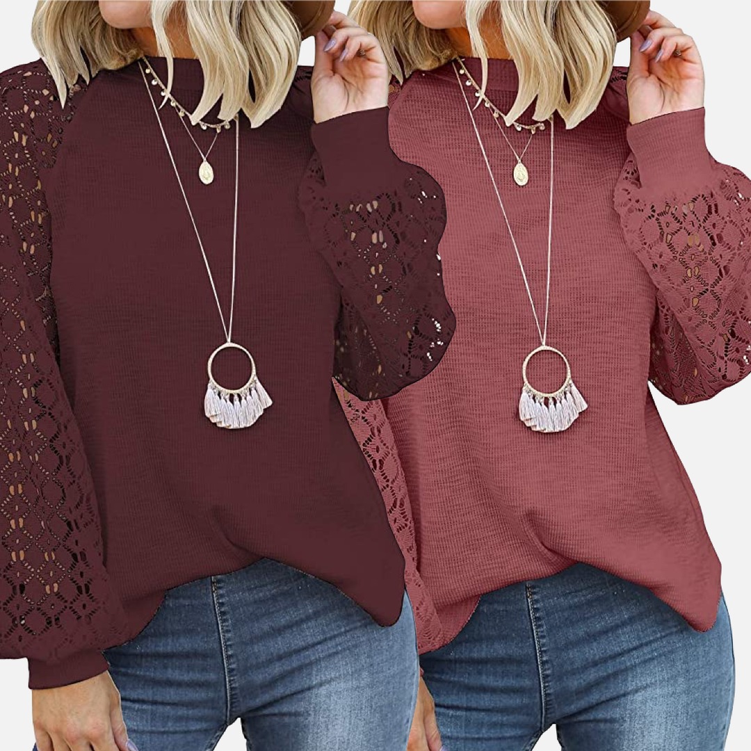 Miholl’s Long Sleeve Lace Top on Amazon is made with high quality lace and soft fabric, comes in over 20 colors and has a size range of S to XX Large. The super fab balloon sleeves really make this top stand out. Plus, it’s so versatile you can wear it with jeans, skirts or slacks. It’s no wonder why it has over 18,000 five-star reviews!