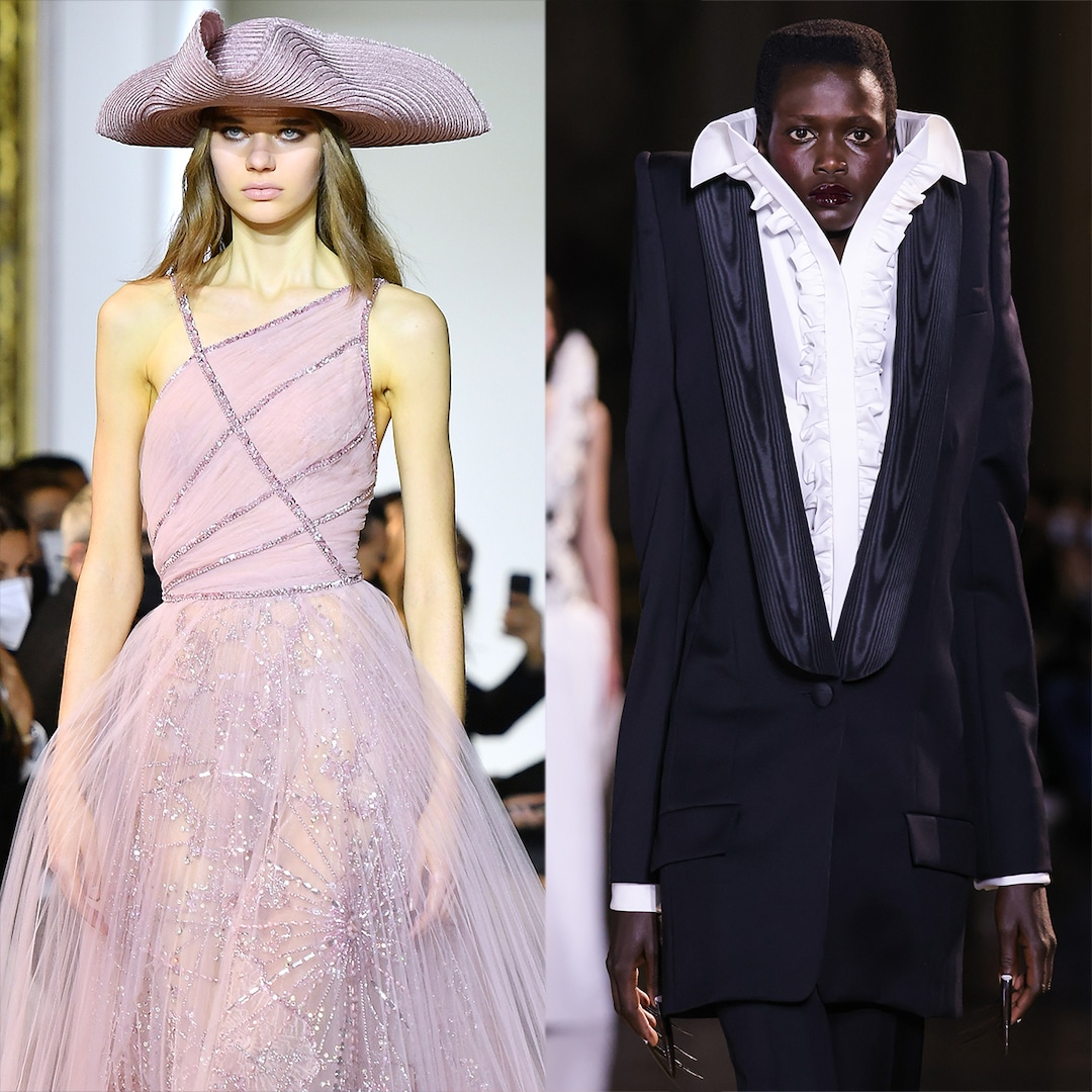 The fashions seem more dramatic than ever. Over at the Viktor & Rolf Spring 2022 couture show, stiff shoulders, constructed corsets and romantic ruffles reigned supreme. According to Vogue, the dramatic collection was inspired by Nosferatu, the 1922 silent Dracula film.