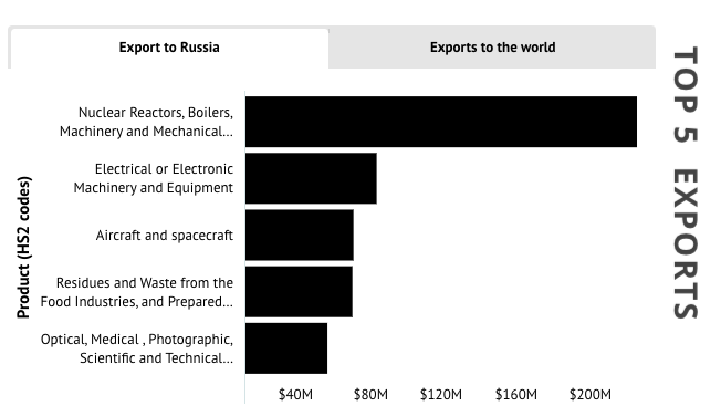 The ITC’s Trade Map shows Canada’s exports to Russia in 2020 totalled $617 million, a third of which included nuclear reactors, machinery, mechanical appliances, and boilers. Other significant exports were helicopters and airplanes, spacecraft, and agricultural machinery.