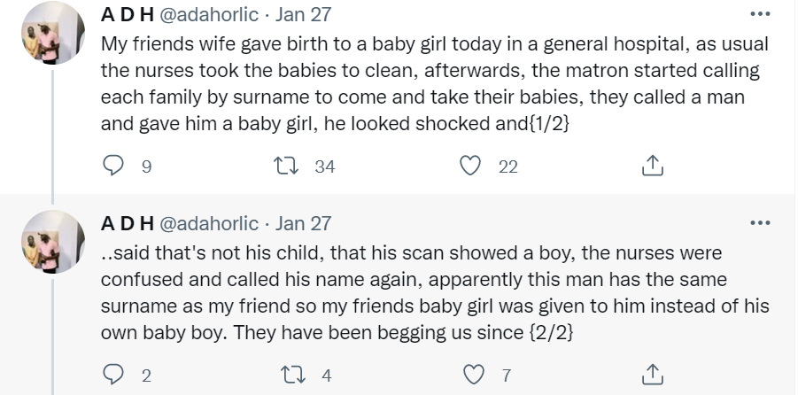 A Nigerian Twitter user has narrated how her friend’s baby was switched with another at a general hospital.