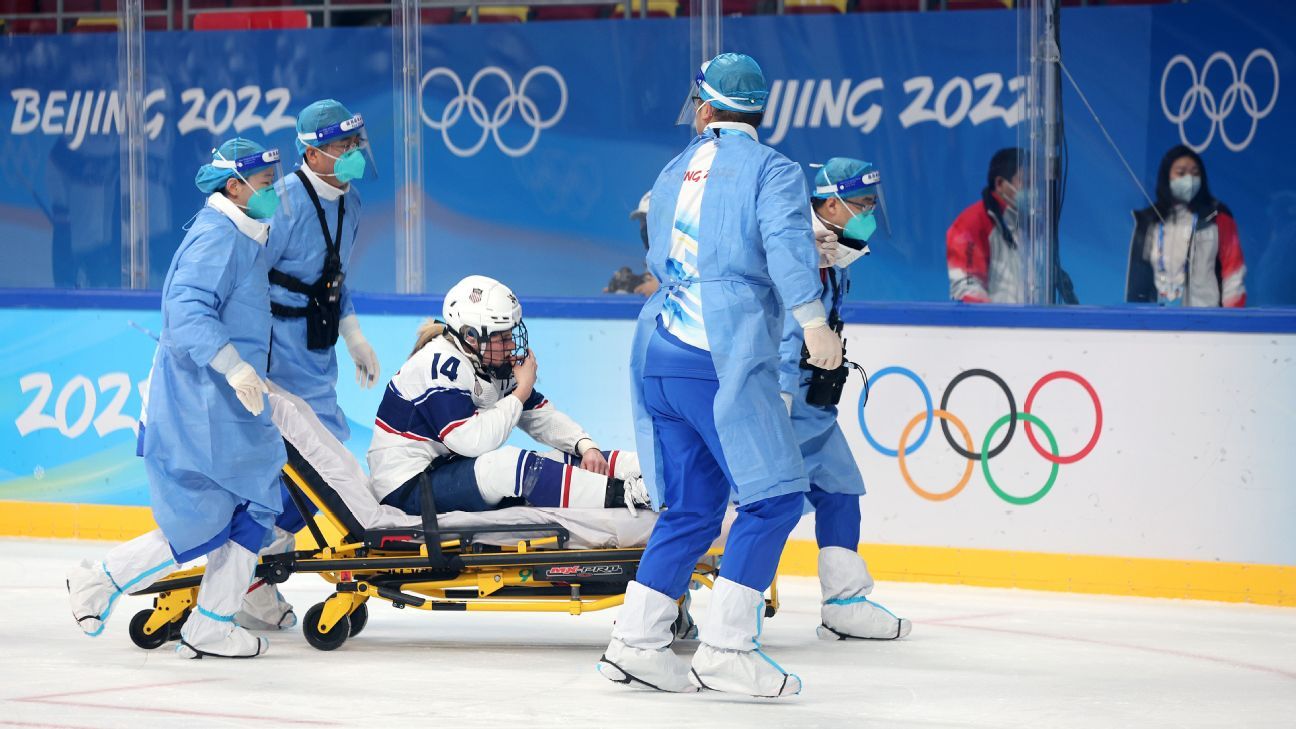 Brianna Decker was stretchered off the ice with what appeared to be a severe leg injury during the U.S. women’s hockey team’s opening game at the Beijing Olympics on Thursday.
