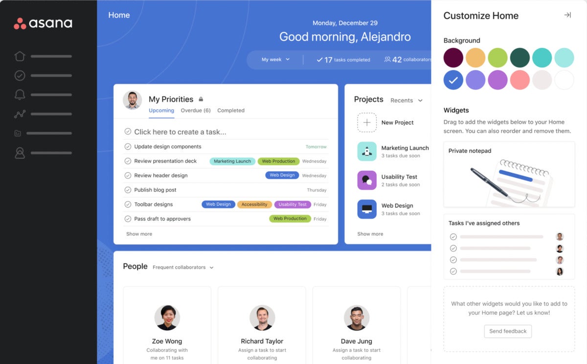 The re-designed Asana Home now functions as an intelligent dashboard to show how individual tasks connect to important workflows, while prioritizing work that contributes to company objectives. Widgets accessible within the dashboard include: