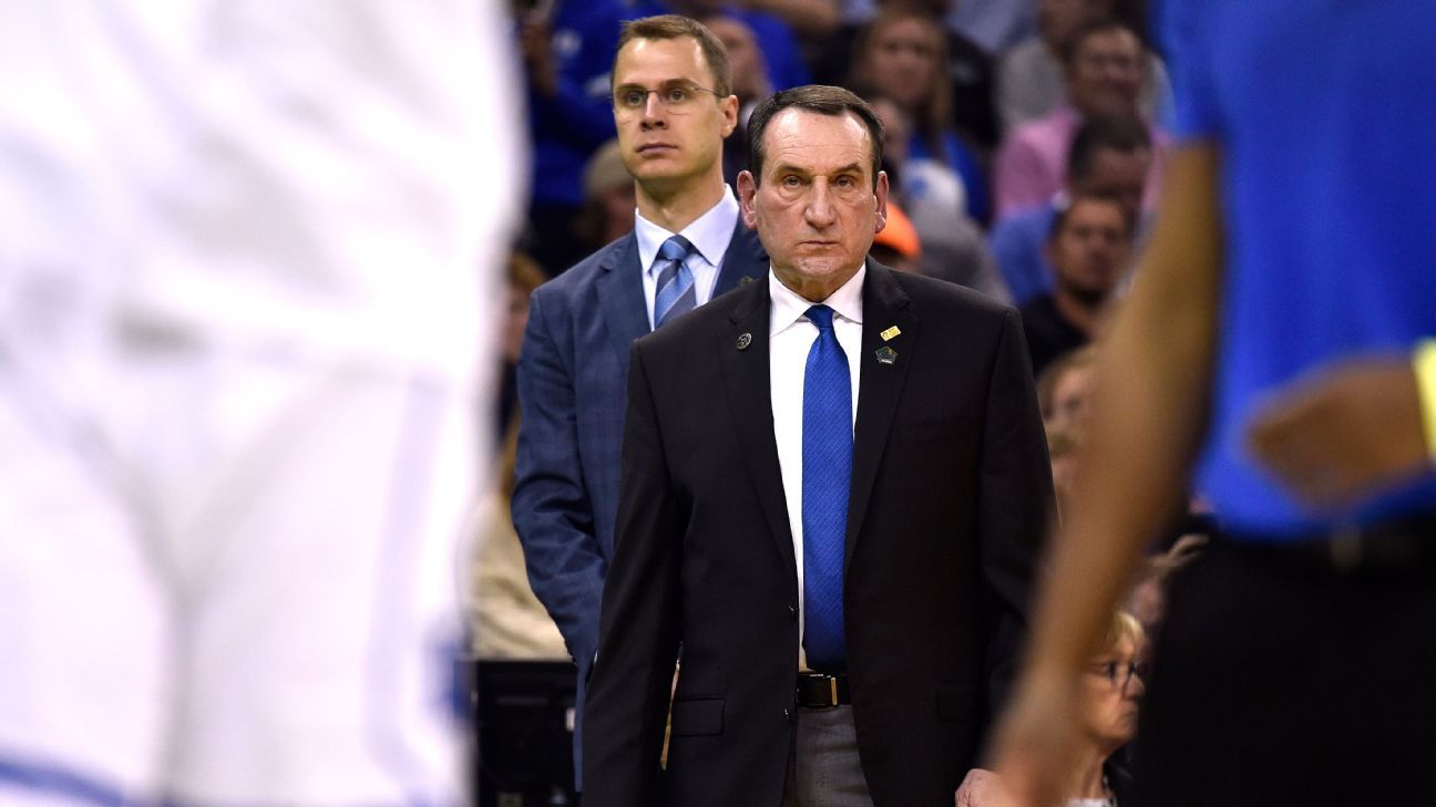 Krzyzewski was in his usual position for the first half, and he walked to the locker room with no obvious issues as the Blue Devils led 42-33 at the break.