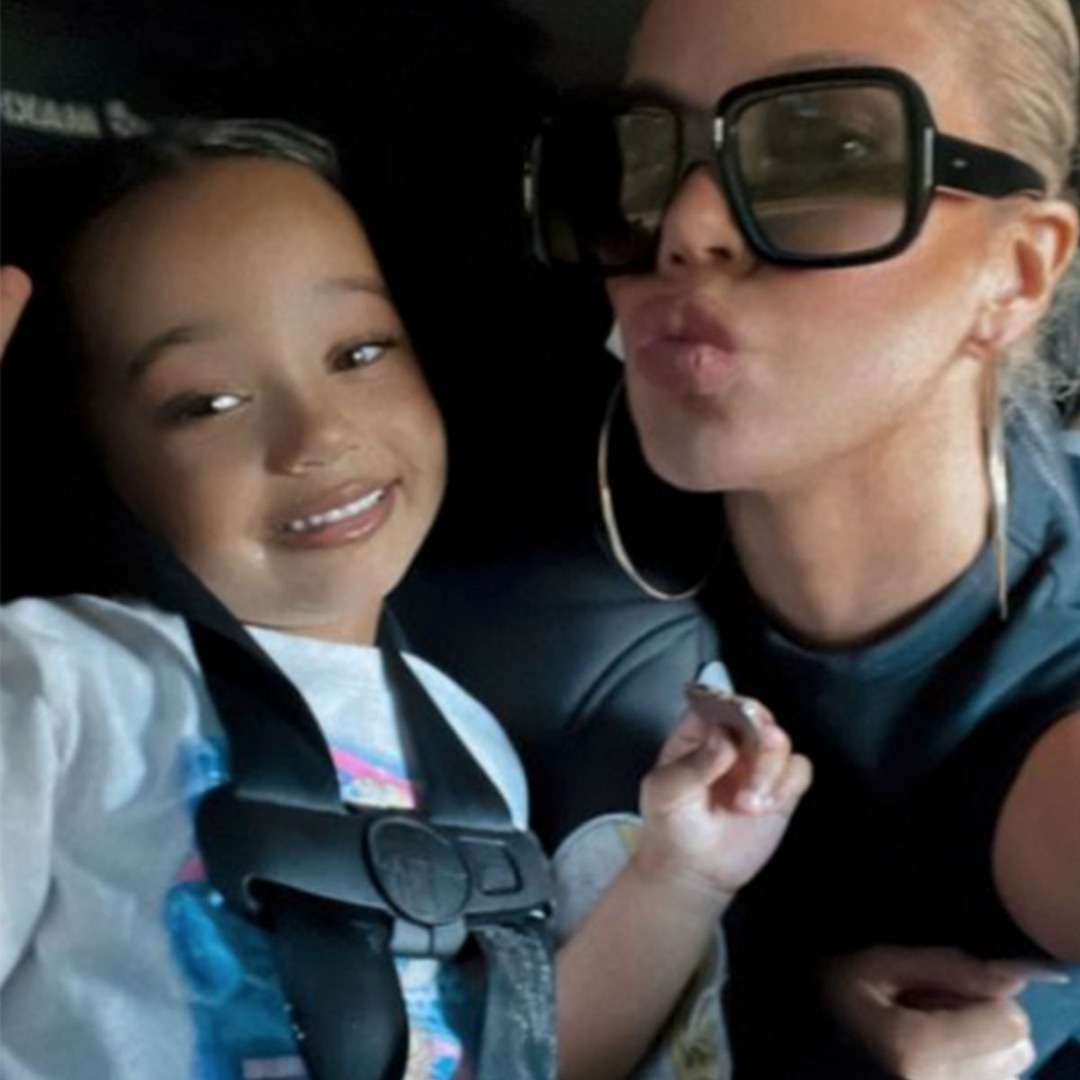 In one sweet snap, the 37-year-old reality star puckers up with a kiss face as True, whom she shares with ex Tristan Thompson, smiles alongside her while buckled up in a car seat.