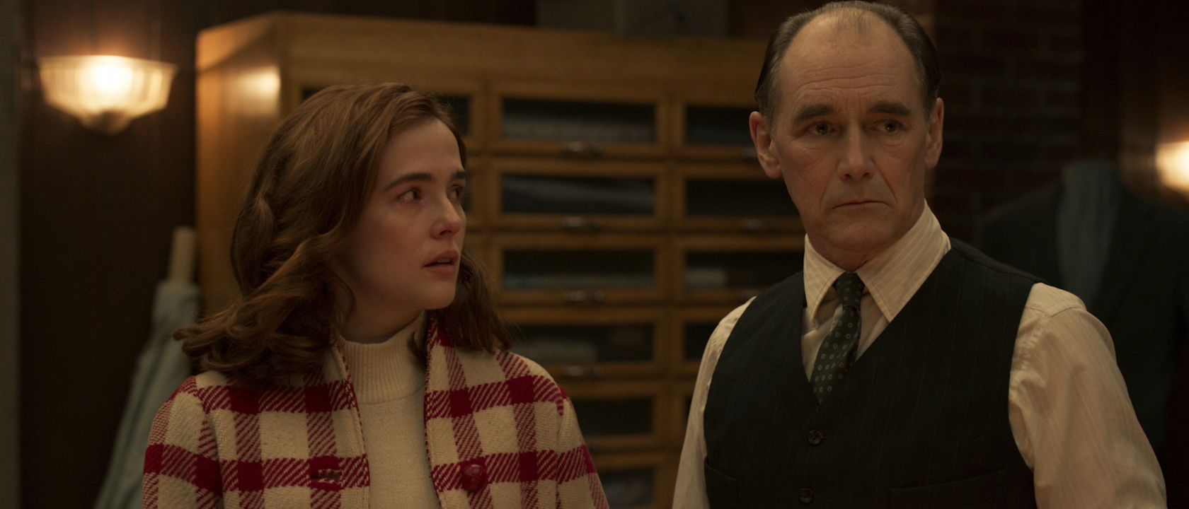 The bulk of the hard boiled, noir-tinged dialogue in The Outfit is given to Rylance’s co-stars, as they represent the hard bitten Chicago from which he sticks on. Mark Rylance gets to interact on a more personal level with both Zoey Deutch’s Mable and Dylan O’Brien’s Richie. With his younger co-stars full of energy and ambition, his patient persona compliments their efforts through the perceived wisdom of age. What’s really happening is that Rylance is accepting a position as the hub of the cast, tailoring his approach with precision to match the performer he’s going up against in any given scene.