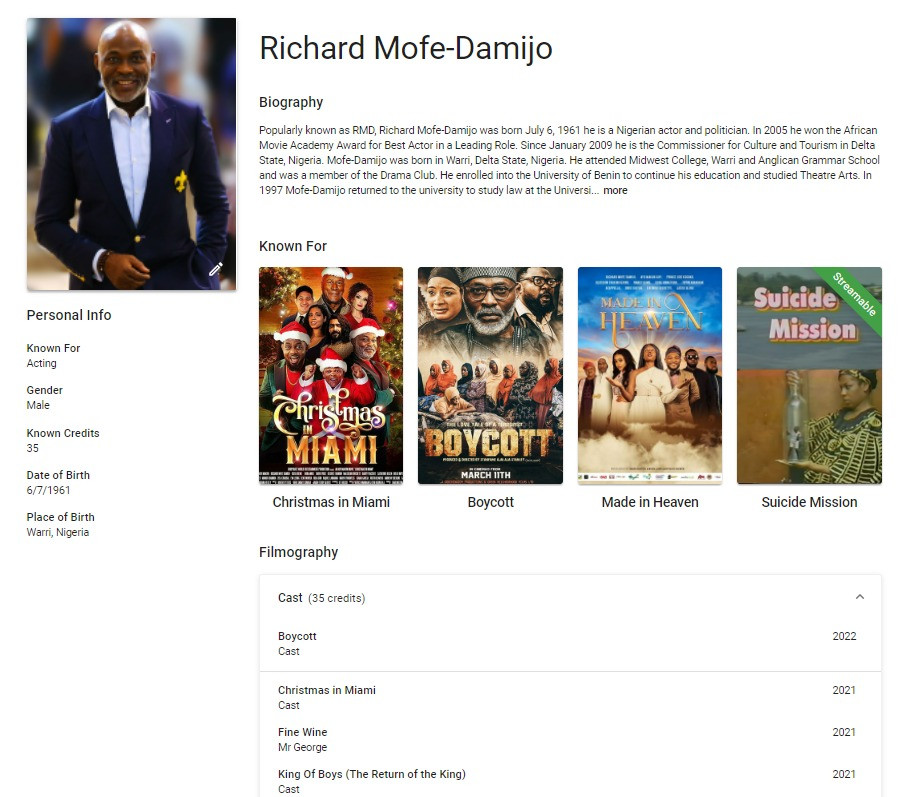 Filmography Remember how you would be fascinated or curious about an actor and would want to check them out immediately? There is no need to go on google only to discover that your person of interest has no Wikipedia page. With AfroDB, you can slide from the 'streaming' feature to the 'people' feature and dig up every tiny bit of information about the personality.
