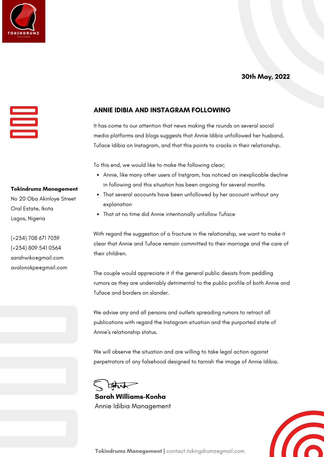 “At no time did Annie intentionally unfollow Tuface” Annie Idibia’s management says the couple remain committed to their marriage
