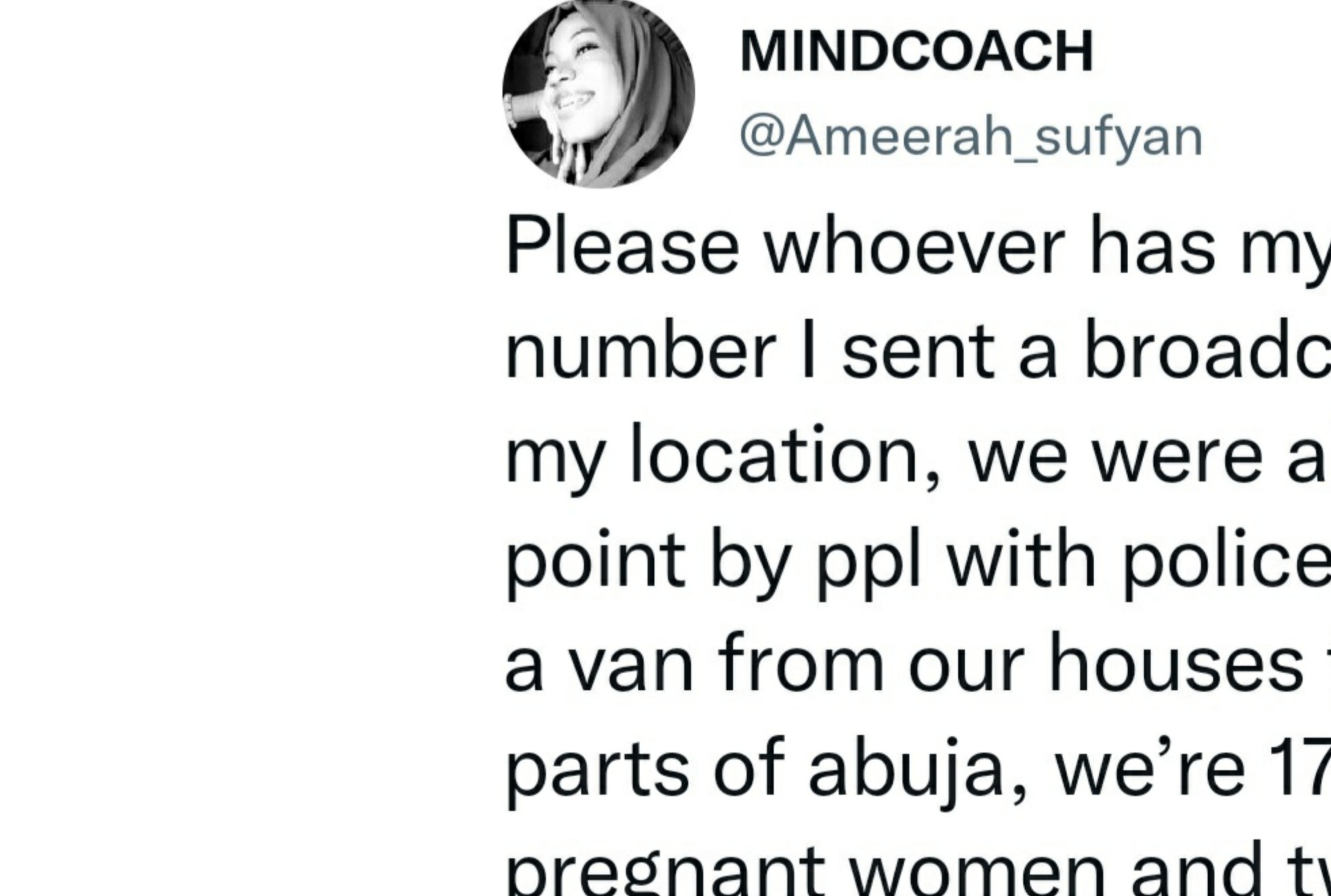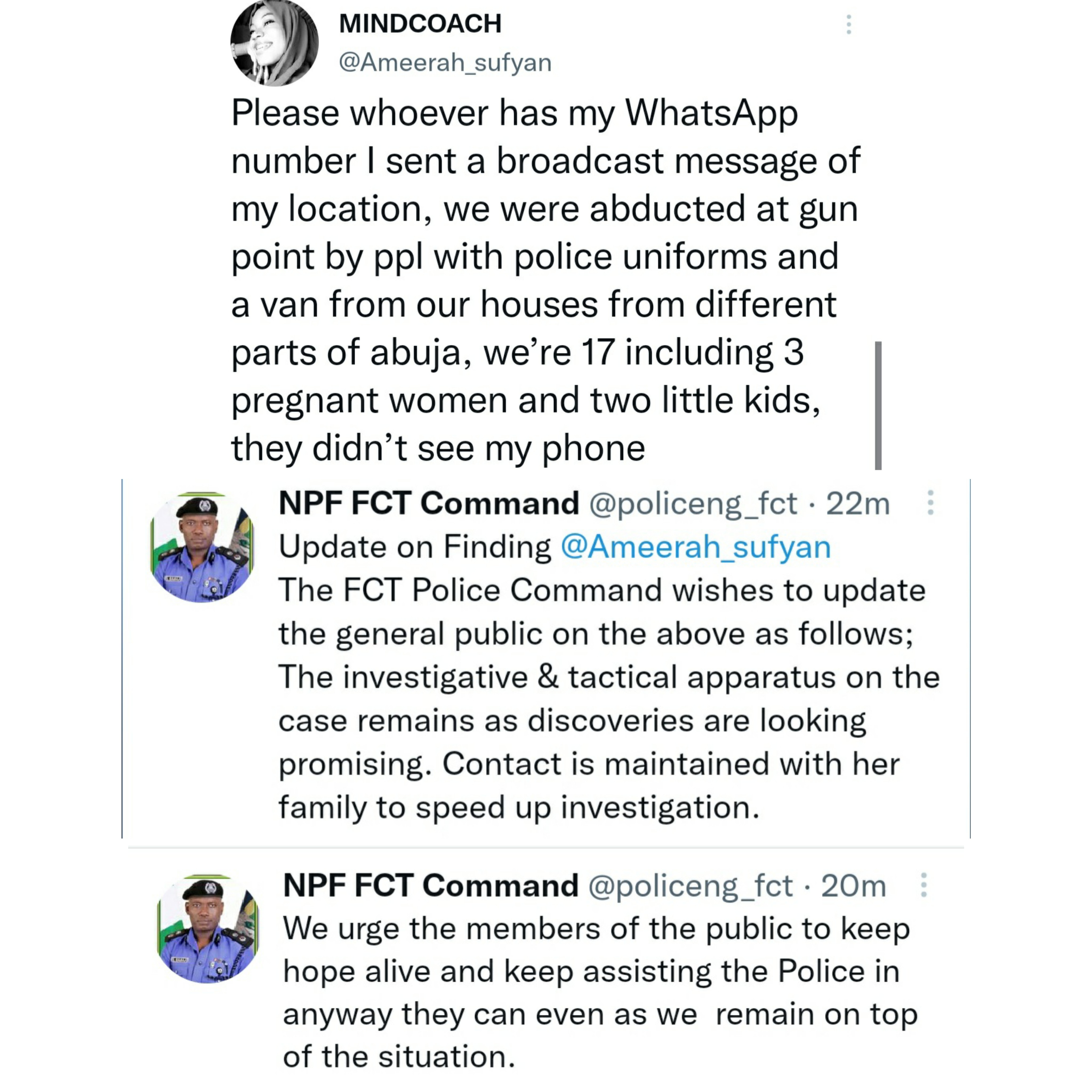 The FCT police command has given an update on the search and rescue operation of a lady who took to her Twitter handle on Tuesday, June 14, to cry out for help. The Twitter user @Ameerah_sufyan said that she and 16 others including three pregnant women were abducted from their homes. In an update given on Twitter, the FCT police command says investigation is ongoing and that discoveries are looking promising.