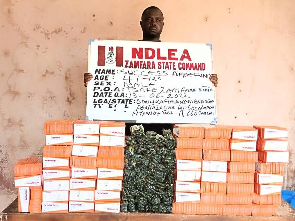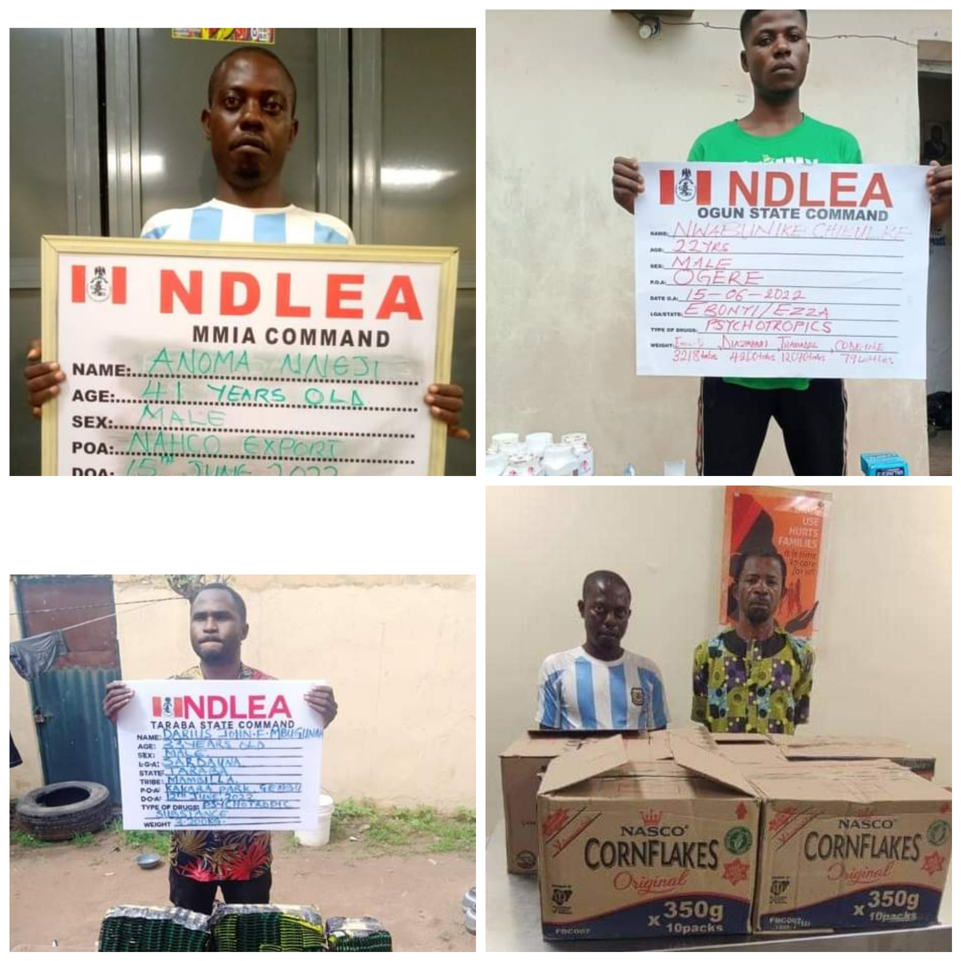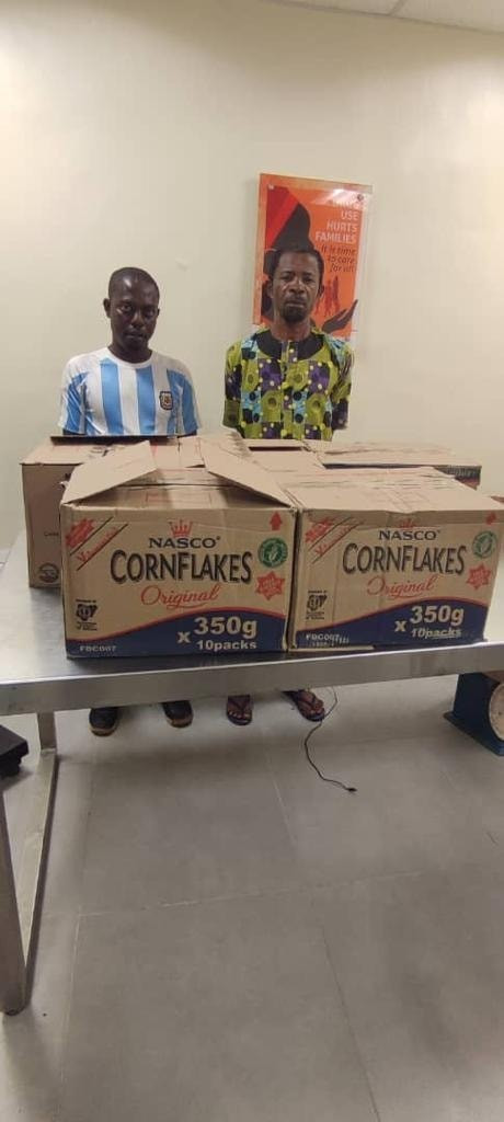 Attempts by drug traffickers to export parcels of Methamphetamine popularly called Mkpuru Mmiri locally concealed in Cornflakes packs and body cream containers to Malaysia and Australia have been foiled by operatives of the National Drug Law Enforcement Agency, NDLEA at Murtala Muhammed International Airport, Ikeja, and a courier company in Lagos. Director, Media & Advocacy, Femi Bafemi, in a statement on Sunday, June 19, said two freight agents; Nneji Anoma And Etoh Barnabas involved in the bid to export nine parcels of Methamphetamine weighing 1.45kg hidden in packs of cornflakes to Malaysia through the NAHCO export shed of the MMIA on Wednesday 15th June 2022, have been arrested. Another consignment of 10 cartons of Tramadol 225mg packaged as Tramaking containing 500,000 tablets with a total weight of 407kg and an estimated street value of Two Hundred Million Naira (N200, 000, 000) have been seized during a joint examination with the Customs at the NCS warehouse. The consignment, which had arrived SAHCO import shed since 6th June from India via Ethiopian Airline was eventually transferred to the NDLEA by Customs on Wednesday 15th June. The previous day, Tuesday 14th June, a similar joint examination with Customs at the Customs enforcement terminal, Tincan seaport, Lagos led to the seizure of 33 parcels of cannabis indica (Colorado) weighing 16.5kgs. The drug exhibit was recovered from a 40-foot container, TRHU 7874497 containing four vehicles. The cannabis coming from Montreal, Canada was discovered in three out of the four vehicles in the container. In the same vein, operatives of the Directorate of Operations and General Investigation, DOGI at the Agency attached to a courier company have intercepted a kilogram of Methamphetamine concealed in body cream containers heading to Australia. Meanwhile, the drug cartels also suffered losses in other operations across Adamawa, Borno, Kogi, Ogun, Zamfara and Taraba state. A notorious drug dealer, Abdullahi Musa, a.k.a Yerima Uding wanted for some past attacks on officers and men of the agency was in the early hours of Thursday 16th June arrested in Hong town, Adamawa state. The 53-year-old suspect was caught with 57 blocks of compressed cannabis sativa, concealed in the boot of his ash coloured Toyota Corolla car with reg. no. GMB 185 MF. He has been fingered as the mastermind of the mob attack in Hong on 6th October, 2020 that led to the death of an NDLEA operative and another officer now bedridden due to permanent incapacitation. In Borno State, another drug dealer Umar Musa was arrested in Tashan Kano, Gwoza LGA on Thursday 17th June with 8,000 capsules and tablets of Tramadol weighing 4.550kgs, while 32.182kgs cannabis were seized by NDLEA operatives along Okene/Abuja highway, Kogi state from a commercial bus travelling from Lagos to Abuja. Following credible intelligence, operatives also arrested one Nwanbunike Chibuike, 22, with 19,576 tablets of Exol-5, Diazepam, Tramadol and Rohypnol as well as 7.9 litres of Codeine at Ogere, Ikenne LGA, Ogun state on Wednesday 15th June. In Zamfara, a consignment of 11,660 tablets of Hyponox and 6,000 ampoules of pentazocine injection was recovered from a drug dealer, Success Amaefuna at Tsafe area of the state on his way to Sokoto state, while 5,000 tablets of Tramadol were seized from Darius John F. Mbugun, 33, who ordered the consignment from Onitsha, Anambra state. The drug exhibit was concealed in a bag of gari for distribution in Gembu, Sardauna LGA, Taraba state. Chairman of NDLEA, Brig. Gen. Mohamed Buba Marwa, commended the officers and men of the MMIA, DOGI, Tincan, Adamawa, Borno, Kogi, Ogun, Zamfara and Taraba Commands of the Agency for the seizures and arrests of the past week. He encouraged them and their compatriots across other formations to remain vigilant and intensify their offensive action against the drug cartels in all parts of the country.