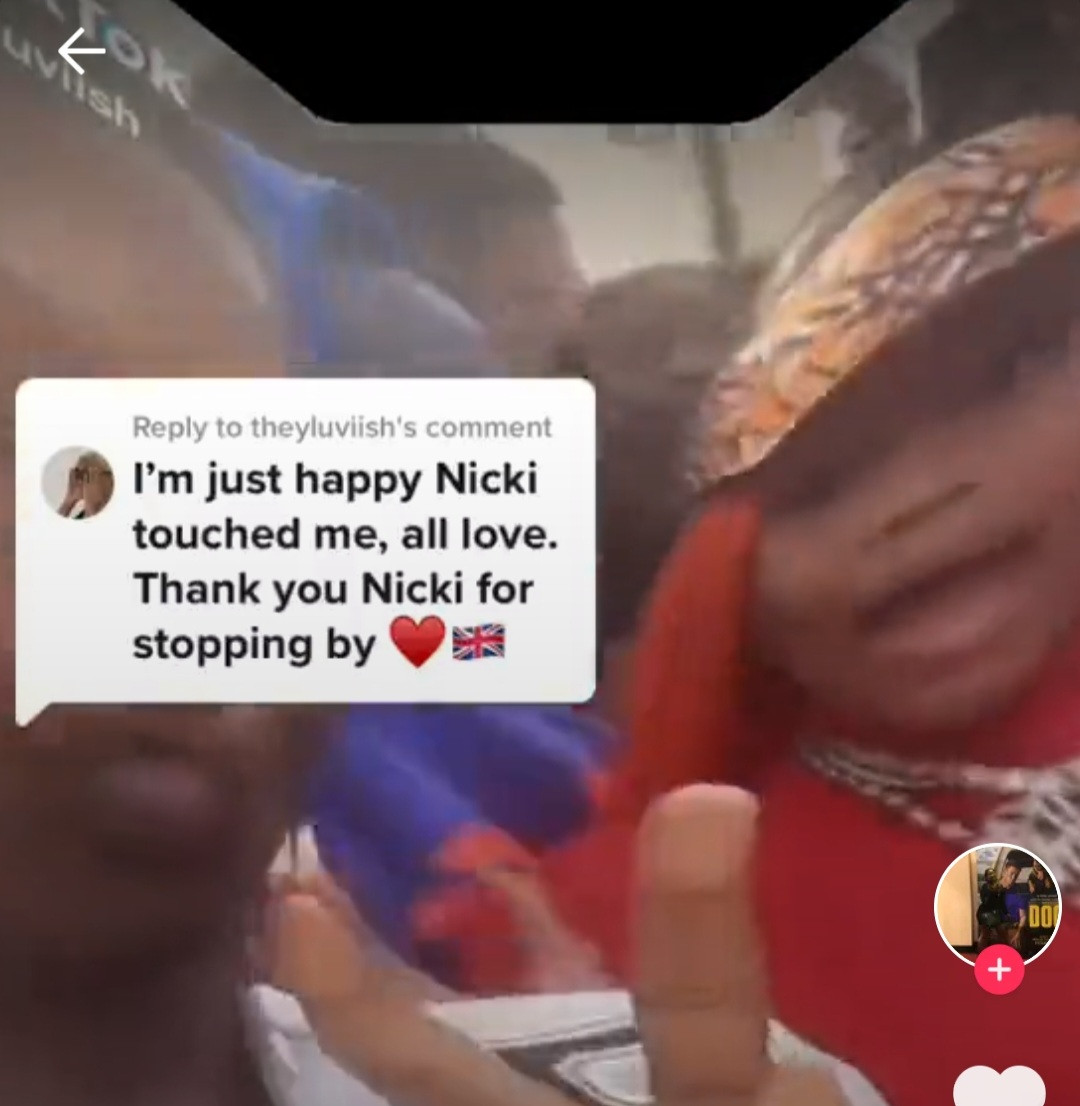 Nicki Minaj was filmed pushing a fan who tried to take a selfie with her at a meet and greet in the UK. The rapper was swarmed by fans during the event and she's seen shushing and scolding her fans while trying to restore order. One fan then tries to quickly take a selfie with her and she's seen pushing him. The fan who was pushed appeared unbothered and later posted on TikTok: "I'm just happy Nicki touched me, all love. "Thank you Nicki for stopping by."