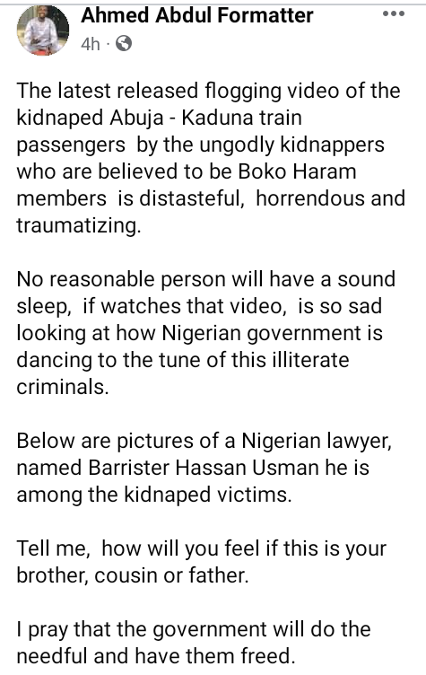One of the abducted passengers who spoke in the new video released by terrorists that attacked a train in Kaduna, has been identified as Hassan Usman, a lawyer. In the new video, the terrorists are seen flogging some of the victims with sticks while they cried and pleaded for help. Barrister Usman and some other victims appeared on camera and spoke, lamenting that the Nigerian government has failed to secure their release. "I am one of those involved in the train mishap. That train belonged to the Federal Republic of Nigeria. The Government has the responsibility to rescue us, but has failed," Usman said. "We called on our relations who were willing to rescue us but the Nigerian government due to being insensitive to our plight did not allow our relations to rescue us "This is why we are calling on the big nations of the world such as England, America, France and the remaining international community, the likes of Saudi Arabia, to intervene in this matter with a view to finding a solution "Truly, these people ( terrorists), their intention was not for us to even spend one week in captivity. They wanted their demands to be met so that they release us. But Nigeria showed no concern over this matter, showing no care "We are therefore calling on these big nations of the world, France, Saudi Arabia,England and America,the international community, ECOWAS, AU, they should please help and intervene in this matter. They should come and help us so that a solution could be reached that will enable us reunite with our families,” he added. One Ahmed Abdul, who posted photos of the lawyer, described the fresh video as distasteful and traumatizing. "The latest released flogging video of the kidnaped Abuja – Kaduna train passengers by the ungodly kidnappers who are believed to be Boko Haram members is distasteful, horrendous and traumatizing," he wrote. "No reasonable person will have a sound sleep, if watches that video, is so sad looking at how Nigerian government is dancing to the tune of this illiterate criminals. Below are pictures of a Nigerian lawyer, named Barrister Hassan Usman he is among the kidnaped victims. Tell me, how will you feel if this is your brother, cousin or father. I pray that the government will do the needful and have them freed.