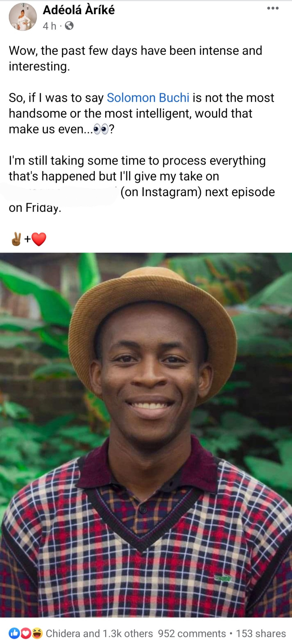Adeola Arike, the fiancée of Solomon Buchi, has reacted after his post about her generated controversy and caused people to advice her to leave him. Solomon had posted that Arike is neither the most beautiful not the most intelligent, but he chose her and that's what love is. It received mixed reactions, with many saying he didn't have to point out his fiancée's shortcomings. Arike has now reacted to the uproar caused by her fiancé's post. She shared an old, unflattering photo of Solomon Buchi and wrote: "Wow, the past few days have been intense and interesting. "So, if I was to say Solomon Buchi is not the most handsome or the most intelligent, would that make us even…? "I'm still taking some time to process everything that's happened. "She added that she will give her take on her podcast this Friday."