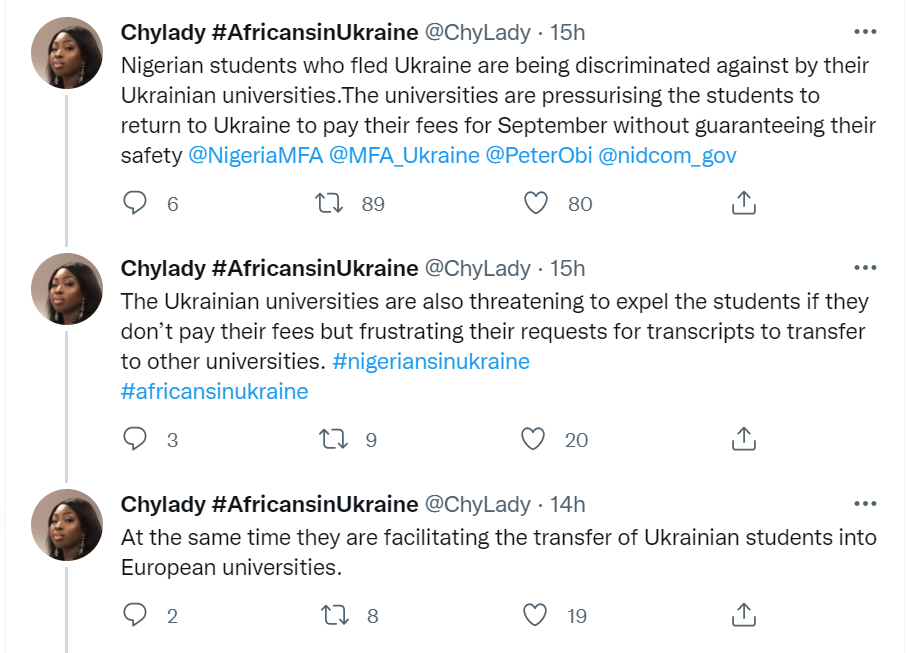 A Nigerian lady has narrated the discrimination Nigerian students who fled Ukraine following the ongoing war with Russia, are being subjected to by universities in the European country. @Chylady revealed that Nigerian students who fled Ukraine are being pressurized to pay their fees for September and return to the country without their safety being guaranteed. She also said the Ukrainian universities are threatening to expel the students if they don’t pay their fees and are also frustrating their requests for transcripts to transfer to other universities. It was also alleged that while these universities are facilitating the transfer of Ukrainian students into European universities, they threaten African students who request for their transcripts and also insist they must pay they must their school fees or risk getting expelled. Read the tweets below….. Nigerian students who fled Ukraine are being discriminated against by their Ukrainian universities.The universities are pressurising the students to return to Ukraine to pay their fees for September without guaranteeing their safetyThe Ukrainian universities are also threatening to expel the students if they don’t pay their fees but frustrating their requests for transcripts to transfer to other universities.At the same time they are facilitating the transfer of Ukrainian students into European universities.Also I was told that African students who requests for their transcripts are told they must pay for the next years full fees and agree to be expelled.. this is insaneUkrainian universities are threatening African students who fled Ukraine with cancellation of resident permits if they request for transcripts. The students are also denied transfer opportunities into EU universities for many reasons including not having transcriptsThey have asked african students to pay for the next September session & go back into Ukraine to continue their studies while mandating that they must sign a document stating they are going back at their own risk & the Ukrainian university will not be responsible for their safety
