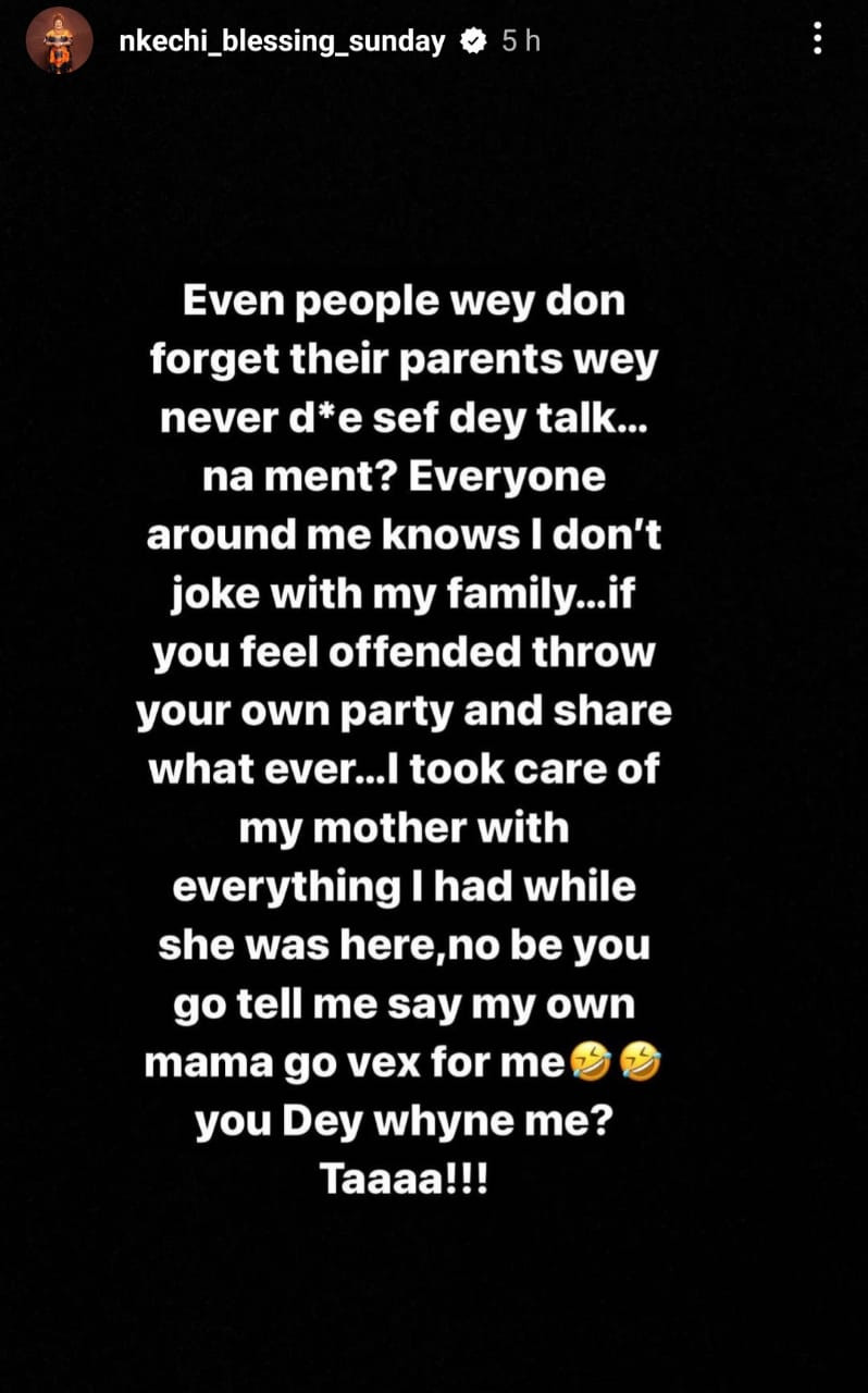 Nollywood actress, Nkechi Blessing Sunday, has slammed people who criticized her for sharing dildos as souvenirs at her mother's memorial ceremony on Sunday. A video of the actress distributing the sex toys to some ladies at the ceremony was shared online. Responding to the backlash she received via her Instastories, Nkechi asked her critics to leave her alone. She argued that those who are bashing her do not take care of their parents as opposed to her, who made sure she cared for her mother before she died. She said her mum was proud of her when she was alive and is even proud of her in death. Read her posts below….