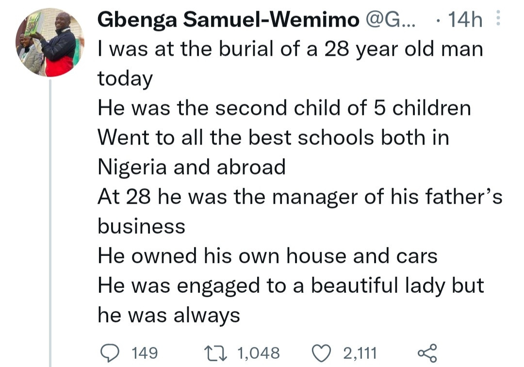 A man reportedly committed suicide because he thought his parents treated his siblings better than him. A man who attended the funeral shared this on Twitter. He said the deceased is a 28-year-old man who misinterpreted everything his parents did for him. When he was almost expelled from a private university in Nigeria, his father quickly sent him to a school in the UK, but the young man saw it as his father sending him away to save face. The man reportedly committed suicide last Friday and was buried yesterday, October 17. His parents were not at the funeral due to cultural reasons and his siblings, who are all abroad, couldn't attend. See below.
