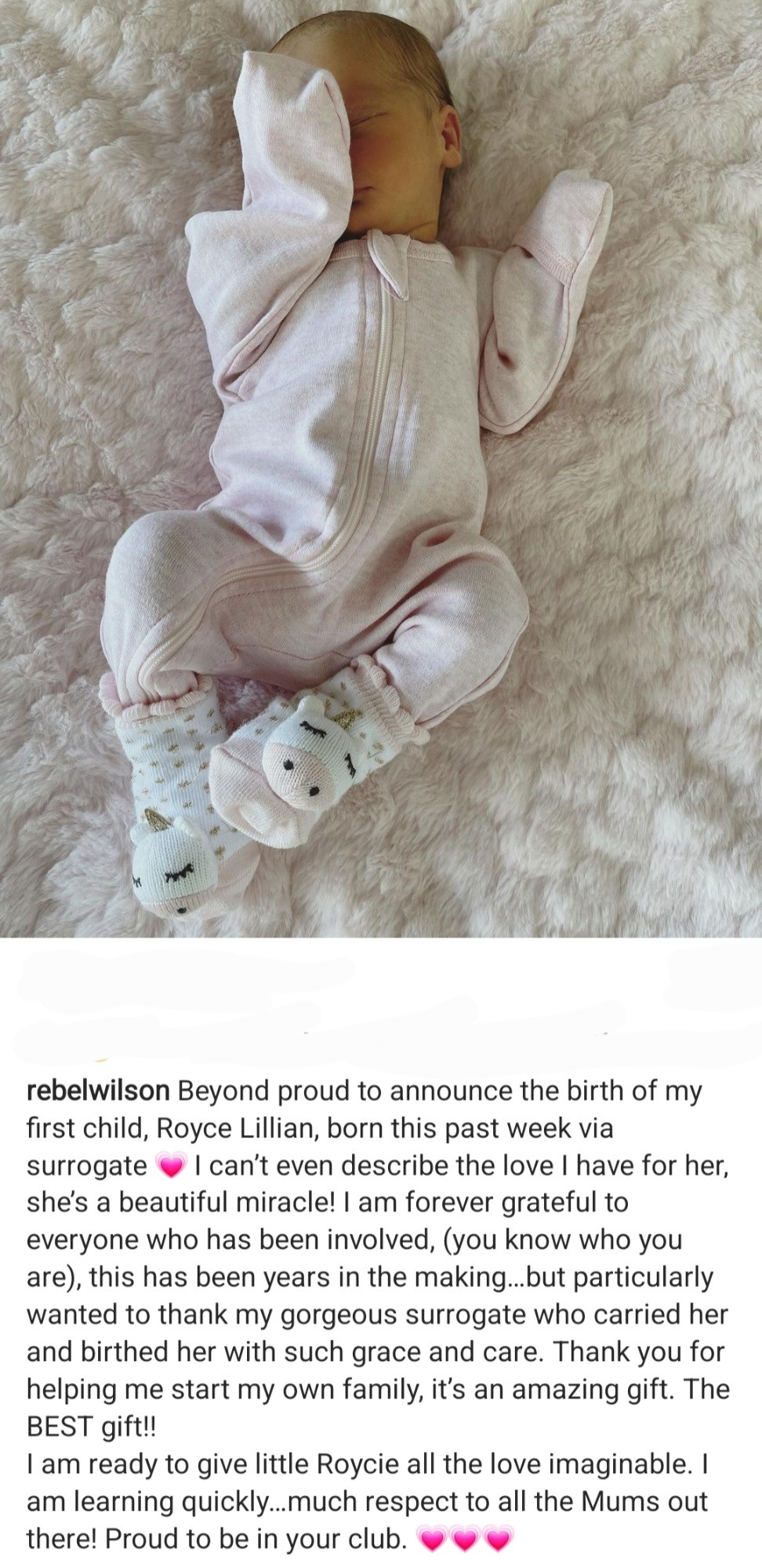 Rebel Wilson has become a new mum after welcoming a daughter via a surrogate. The Pitch Perfect actress revealed the exciting news via Instagram on Monday, Nov. 7. She shared an adorable photo of her daughter, Royce Lillian. She wrote: "Beyond proud to announce the birth of my first child, Royce Lillian, born this past week via surrogate. "I can’t even describe the love I have for her, she’s a beautiful miracle! I am forever grateful to everyone who has been involved, (you know who you are), this has been years in the making…but particularly wanted to thank my gorgeous surrogate who carried her and birthed her with such grace and care. "Thank you for helping me start my own family, it’s an amazing gift. The BEST gift!!"