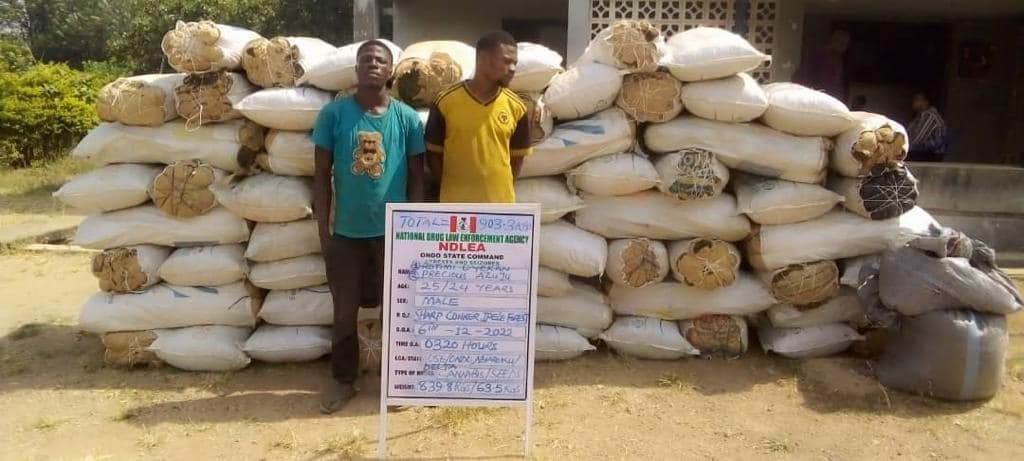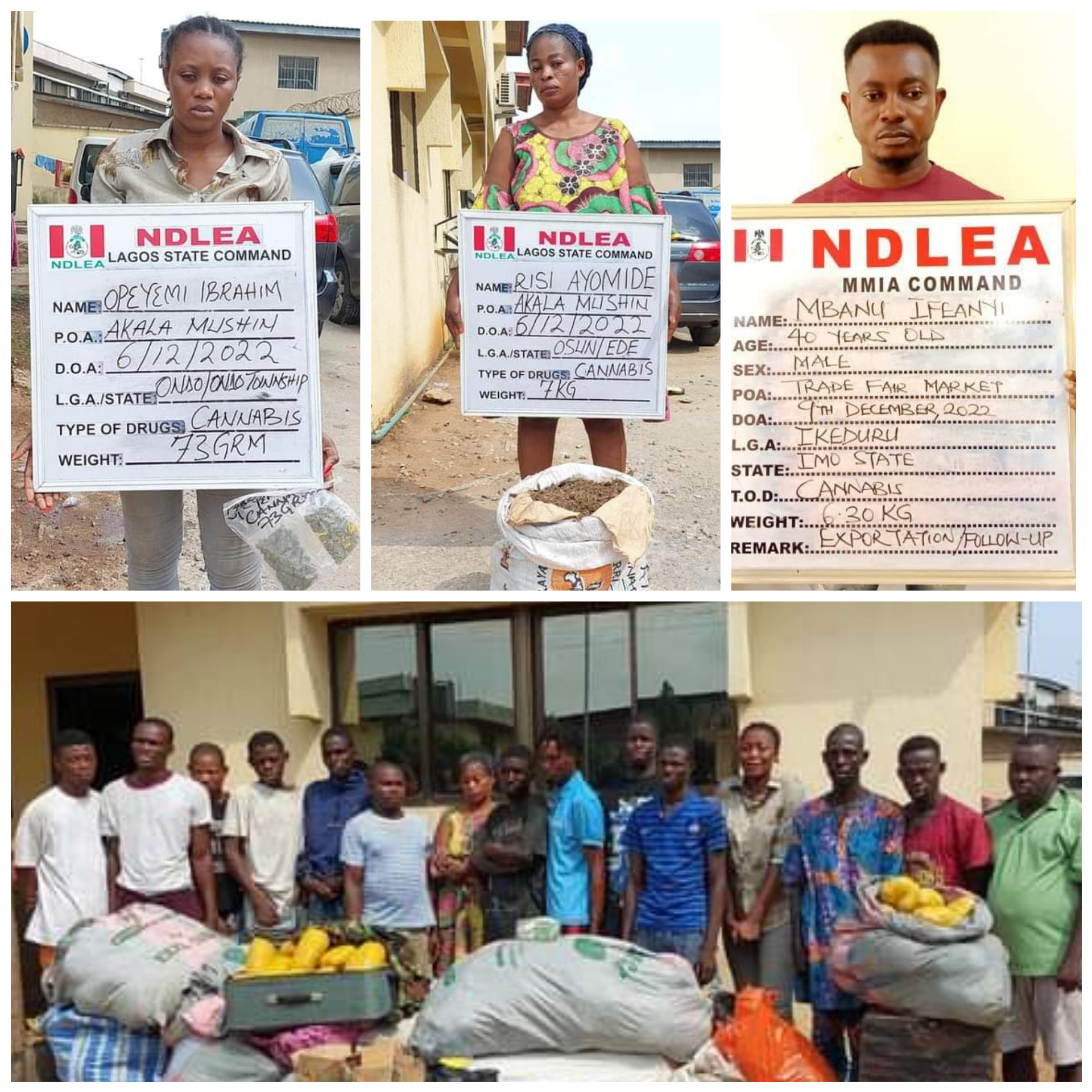 Operatives of the National Drug Law Enforcement Agency, NDLEA, have arrested 20 drug dealers suspects including women and seized tons of narcotics in Ondo, Kebbi, Akala and Idumota area of Lagos State. Spokesperson of the agency, Femi Babafemi, disclosed this in a statement on Sunday, December 11, 2022. At the Akala notorious drug hub in Mushin area of Lagos, no fewer than 15 drug dealers including two ladies were arrested with 1,400kgs of cannabis sativa among other illicit substances such as heroin, methamphetamine, and 320 bottles of codeine syrup recovered from them during a raid of the area on Friday 9th December. Another raid of the popular Idumota business district of Lagos Island on Saturday 10th December led to the seizure of 35,014 pills of tramadol, diazepam, rohypnol and 21.2 litres of codeine syrup while a targeted notorious dealer is still on the run. This is even as officers of the Directorate of Seaports Operations of the Agency arrested a Malian, Dembele Ousmane on Monday 5th December with 32,400 capsules of tramadol 225mg concealed in factory packed buckets of custard while attempting to travel to Mali via boat at Ebute -Ero Jetty in Lagos. In Ondo state, operatives on Tuesday 6th Dec. stormed sharp corner, Ipele forest in Owo area of the state where they arrested Rotimi Oyekan and Precious Aluju with C/S weighing 903.3kgs, while another team of NDLEA officers arrested Babatunde Oluyara at Igbotako area of the state, with 168.5kgs of the same substance; 6kgs of monkey tail and various quantities of methamphetamine, cocaine and heroin. On Monday, 5th December, two suspects: Abdullahi Bala and Ibrahim Wade were intercepted along Koko- Kebbi road in a Dyna Truck loaded with 114 bags of the same substance weighing 1,140 kilograms concealed under crates of soft drinks. While commending the officers and men of the MMIA, Seaports Operations, Ondo, and other commands, for their hard work and diligence leading to the arrests and seizures of the past week, Chairman of NDLEA, Brig. Gen. Mohamed Buba Marwa urged them and their compatriots across other formations to intensify their efforts.